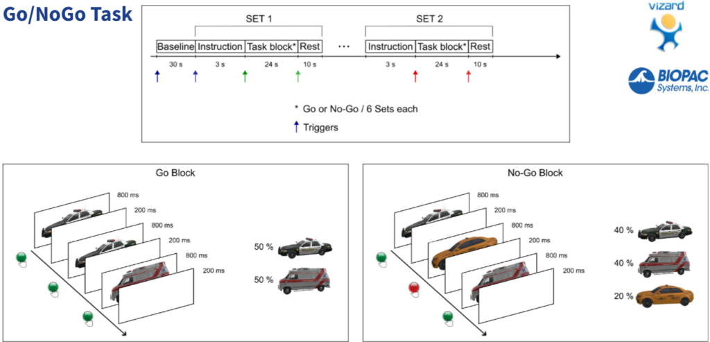 p1_acq_layout.jmms, digpts.txt, p1_3D_data.csv): Contains the 3D coordinates for all sensors and cranial landmarks (Nz, Iz, LPA, RPA), along with head distances (e.g., circumference 55.0 cm). It defines EEG channels and NIRS channels (LED-Detector pairs) with their exact inter-optode distances (e.g., LED2_DET2 at 2.0 cm, LED14_DET4 at 9.1 cm).p1_sensorsLandmarks_img.png, Go_NoGo_NIRS_EEG_Simplified_Layout.png): Visual representations of the sensor placements, mapped to cortical areas such as the Frontal, Motor, Sensory, Somatosensory, and Visual areas, often using the International 10-20 EEG system nomenclature.Experimment_design.png): Outlines the “Go/NoGo Task” structure, which includes a baseline period, instruction, and two primary task blocks (Go and NoGo). Stimuli are presented for 800 ms with a 200 ms inter-stimulus interval.
